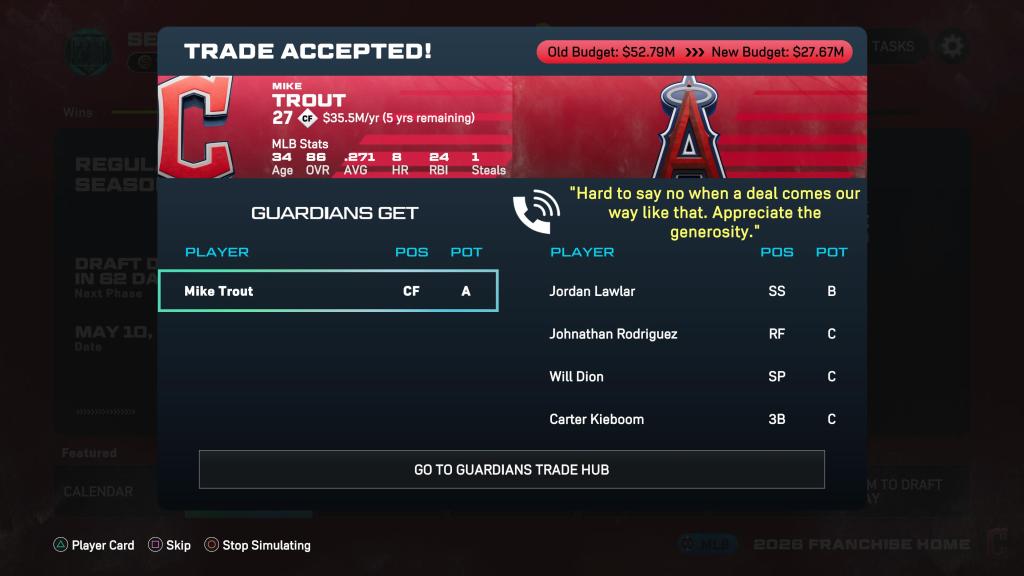 He showed quickly that the bat speed and arm are still viable and we sent him to another surprise contender desperate to show success and keep their young stars – Pittsburgh sent us an offer of Termarr Johnson (2B/3B) and another prospect. It was an easy decision as Trout has star power the Pirates need on offense and we desperately need to find the heir apparent for Jose Ramirez as well as a potential filler for the middle infield. Johnson filled both roles.
