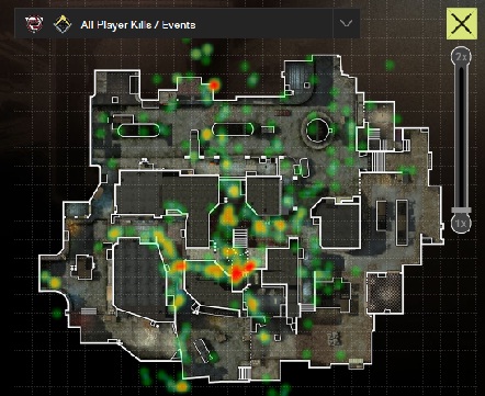 The brighter the spot on the map, the more shots were fired from that spot. This will often show you what we call the ‘Bottlenecks’ of a map. (This map is ‘Bootleg’)