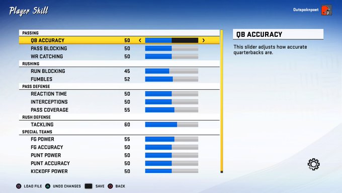 The passing game isn’t bad from the user perspective, close to default for user passing feels good and CPU INTs will punish you if you’re sloppy. However, CPU Robo QB is alive and well at default. This will need to be tuned with User Pass Rush, Pass Coverage and INTs – CPU Pass Blocking needs bumped slightly (maybe 55 or 60?).